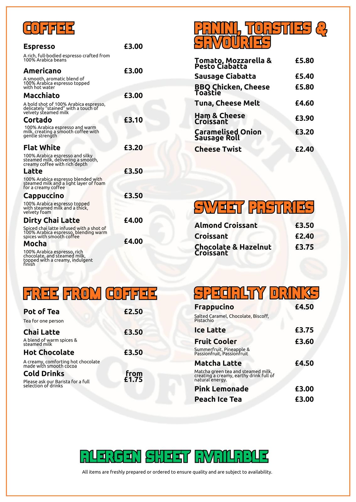 We serve fresh, local produce every day – milk from Northiam Dairy, pastries from The Sussex Kitchen, and independent bakes from Moody Bean. All our coffee is made with 100% Arabica specialty beans from Summit, crafted with care on our La Marzocco machine.